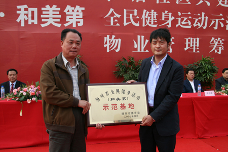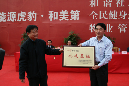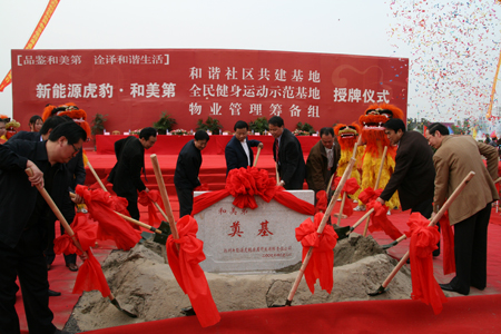 和美第项目继承了新能源创新到永远;的风格,在生态、健康、运动风格的基础上首次在扬城提出了和谐之风,并贯穿到前期规划之中,连续召开了和谐社区标准座谈会与和美第;和谐社区建设研讨会,并与市精神文明办签订了和谐社区共建协议。同时,为将和美第项目真正打造成和谐社区,此次新能源物管将于前期即介入项目。此次奠基仪式不仅颁授了[新能源虎豹和美第]和谐社区共建基地、全民健身运动示范基地,还同时举行了物业管理筹备组授牌仪式。