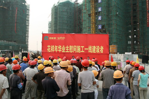 8月13日下午四点多钟,带着数百份慰问品的几位业主来到花样年华工地现场,慰问高温下坚持在施工一线的工作人员。业主代表向施工人员的辛勤劳动表示感谢并发表了热情洋溢的讲话。参加慰问的业主们表示:买房是每个家庭的一件大事,而买到称心如意的房子则是关系到未来生活的一个关键,因此都对施工质量非常关注。但是看到工人师傅们在接近40度的高温下作业确实非常不容易,新能源花样年华的施工队伍为了把雨季耽误的时间抢回来,确保按时间高质量交付,即使高温酷暑也在尽力坚持,这是为业主负责任,因此想表示表示心意,来看望慰问大家!