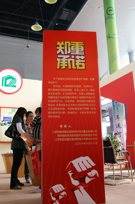 在房展会开幕式上,江苏新能源置业集团被授予扬州市区优秀房地产企业;。同时在房展会上江苏新能源置业集团有限公司、江苏新能源置业集团有限公司泰兴分公司、扬州新能源虎豹房屋开发有限公司、扬州鸿泽置业有限公司为了确保业主购买的房屋资产保值,向社会作出郑重承诺:即日起凡是新购买和美第、花样年华、泰兴新城市花园的房屋,买受人自订立《商品房买卖合同》之日起两年内,如果上述楼盘在同幢房屋中出现销售价格低于该幢楼开盘公示价的降价行为。公司承诺:将把差价全额返还给业主,并承担业主从买房之日起至降价之日止已交房款的利息,利率标准按照银行同期一年定期存款利率计算。