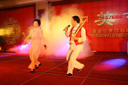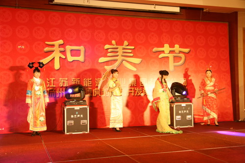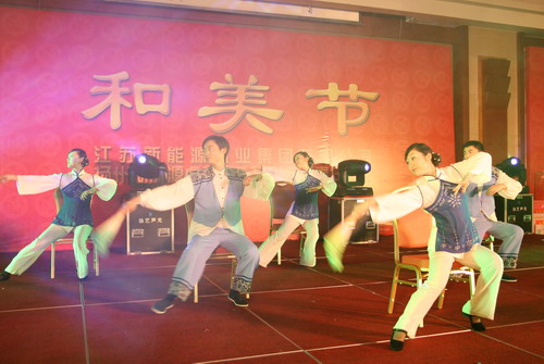 当新能源集团公司的四位美女和两位帅哥表演的舞蹈《青花瓷》作为开场节目表演时,董事长包广林惊奇地问:这些演员难道是我们的员工吗?;节目真是形式多样,一个比一个精彩。表演戏曲串烧的男员工唱的是有板有眼,女员工唱的是韵味十足,令人回味无穷;音乐小品《工地情缘》更是新能源人将紧张的工作原汁原味地搬上舞台,展现了新能源人越是坚难困苦,越发豪情满怀的精神面貌。表演花鼓戏《刘海砍樵》的两位员工热情洋溢、十分投入;演唱《卓玛》的刘总身着藏族服装,将洁白的哈达献给了现场的嘉宾。泰兴分公司的《动感单车》给人们留下了深刻的印象,五位身穿运动服的员工骑着动感单车,时而左转,时而右转,时而爬坡,时而冲锋,充分体现了我运动,我健康,我快乐;的新能源开发理念;表演时装秀《广陵古韵》的新能源虎豹公司八位美丽的姑娘身着盛装,脚踏猫步,婀娜多姿,面带微笑,在她们的伴随和引领下,公司的老总们也集体闪亮登场时,全场响起了一片热烈的掌声。物业公司的女声独唱《谁不说俺家乡好》和《风含情水含笑》抒发了新能源人对家乡的热爱之情,武术表演则用男性特有的阳刚之气表达了新能源物业人为业主保卫家园的勇气和本领。充满青春活力的舞蹈《青春劲舞》和表现异国情调的爵士舞热情奔放,小合唱《北京欢迎你》和烛光舞《平安夜》亲切甜美,使人赏心悦目。如果说男生群舞《开心宝》让人的神经高度兴奋,使人开怀大笑的话,男女对唱《美丽的神话》则充分表达了新城市花园楼盘在泰兴独领风骚的原因,那就是新能源坚定不移地走品牌之路,创精品工程的结果。
