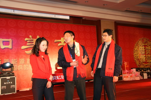 锦绣天边挂,彩虹肩上披,引来吉祥鸟,寒冬报春晖。;新能源虎豹公司顾载兵总裁宣读的颁奖辞不仅是对时装秀的最好诠释,而且是对新能源人迎接挑战,战胜严冬心愿的最好表达。最后时装秀、《开心宝》、《卓玛》、武术表演等四个节目分别获得最佳风韵奖、最开心奖、最甜美歌声奖和最佳功夫奖。 和美节;为10家优秀施工单位及供货商代表颁了奖,还进行了幸运抽奖活动。2个小时的晚会始终洋溢着团结、祥和、热烈、欢乐的气氛。