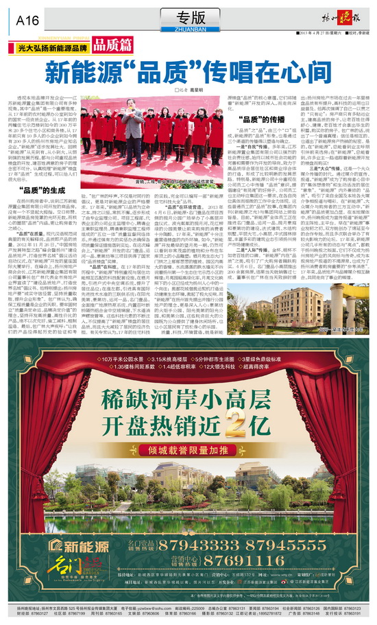 三是大众;传播。这是一个大众媒介传播的时代,通过媒介的宣传、报道,新能源;成为了购房者心目中的集体想像物;和生动活泼的居住意象;。新能源;内外兼修的品质;,吸引了来自全国及本地各大媒介争相报道与喝彩。在新能源;、大众媒介与购房者的三方互动中,新能源;的品质更加凸显。在本地媒体中,扬州晚报成为宣传报道新能源;的主阵地、主平台。早在新能源;事业发轫之初,双方就创办了绵延至今的合作专版,而且多次联合举办了有较大影响力的论坛。17年来,新能源公司几乎所有的动态与亮点;,都载于扬州晚报之版面,它们不仅成为扬州房地产业的风向标与传奇,成为本报房地产报道的不竭源泉,也成为了扬州消费者购房重要的参考消息;。17年来,品质地产与品牌媒介相互融合,共同走向了事业的辉煌。